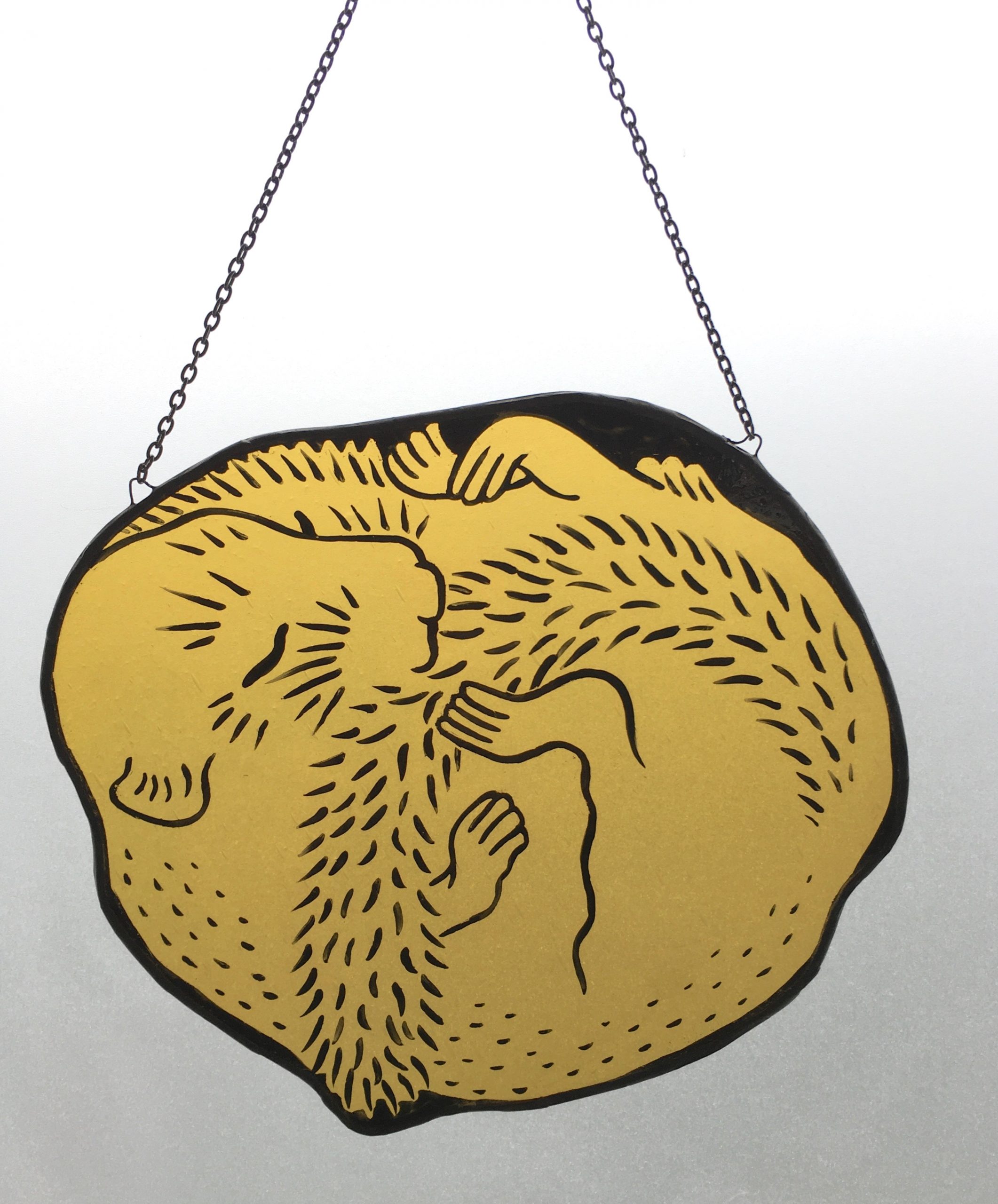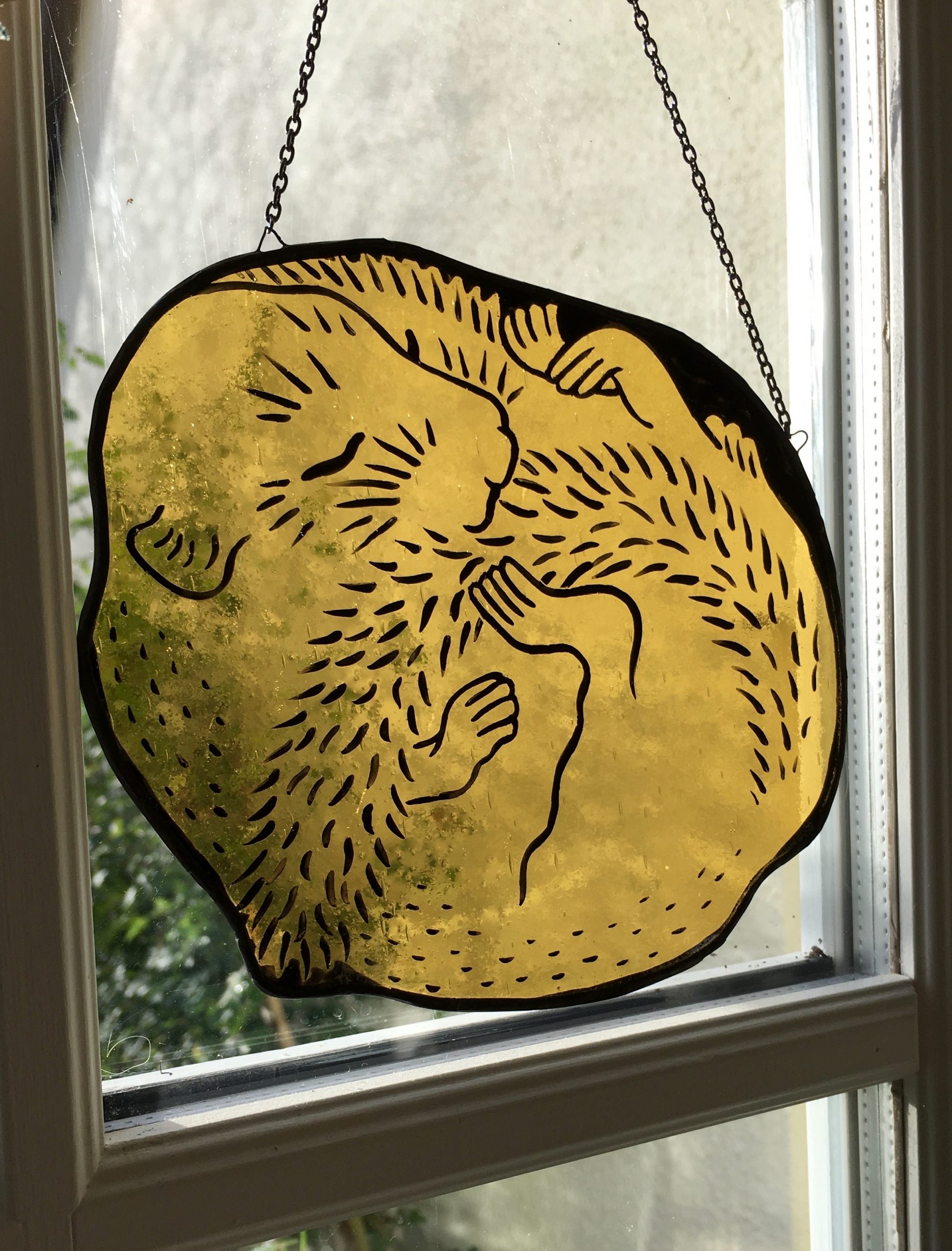 Hand painted stained glass sun catcher of a sleeping harvest mouse.