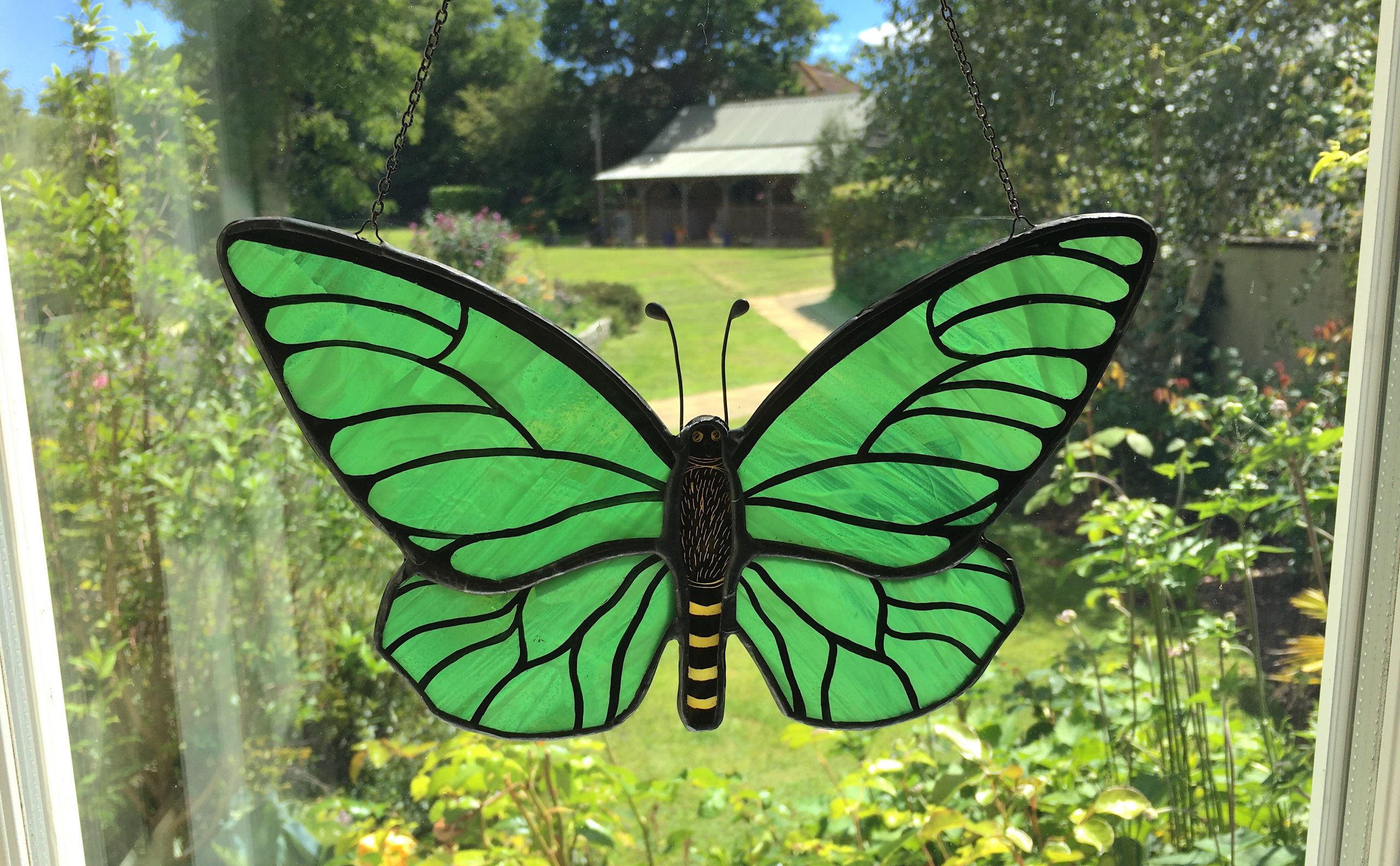Green stained glass butterfly sun catcher in window