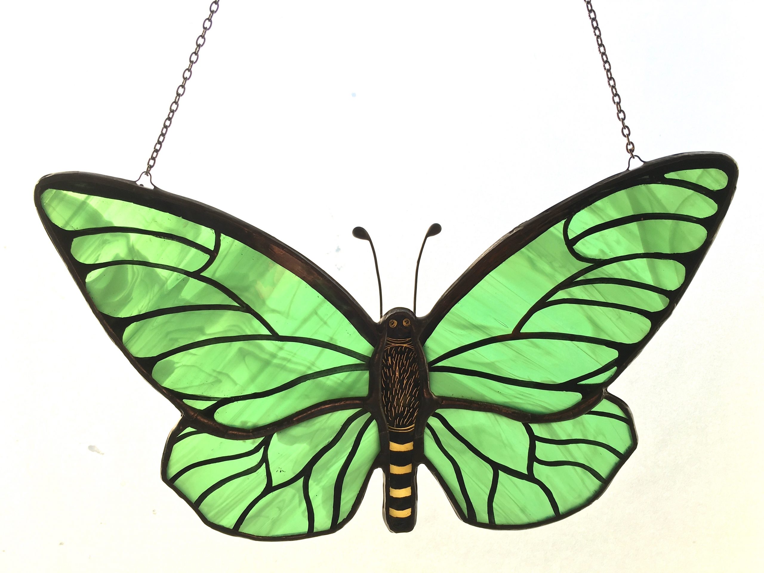 Hand crafted bright green stained glass butterfly sun catcher.