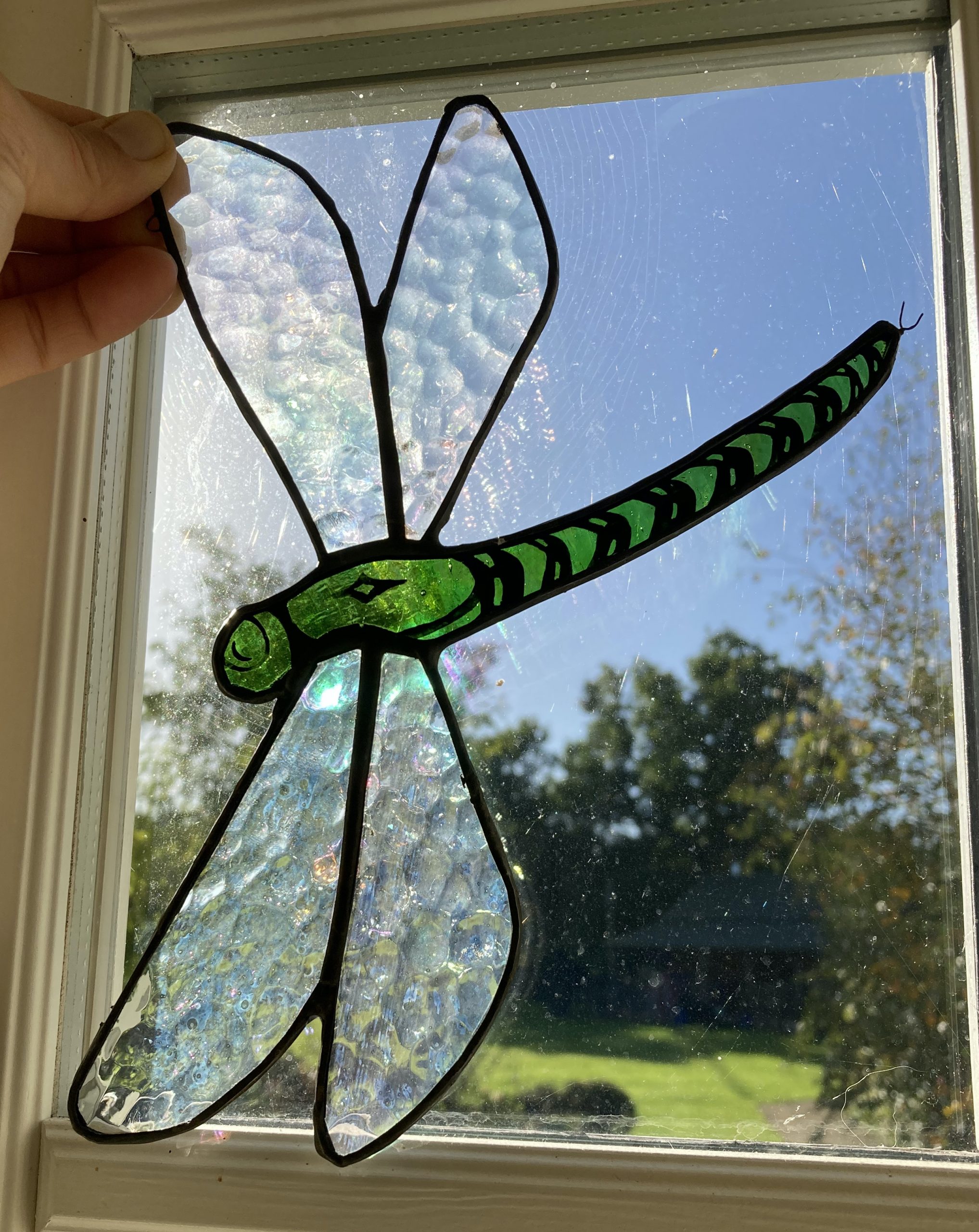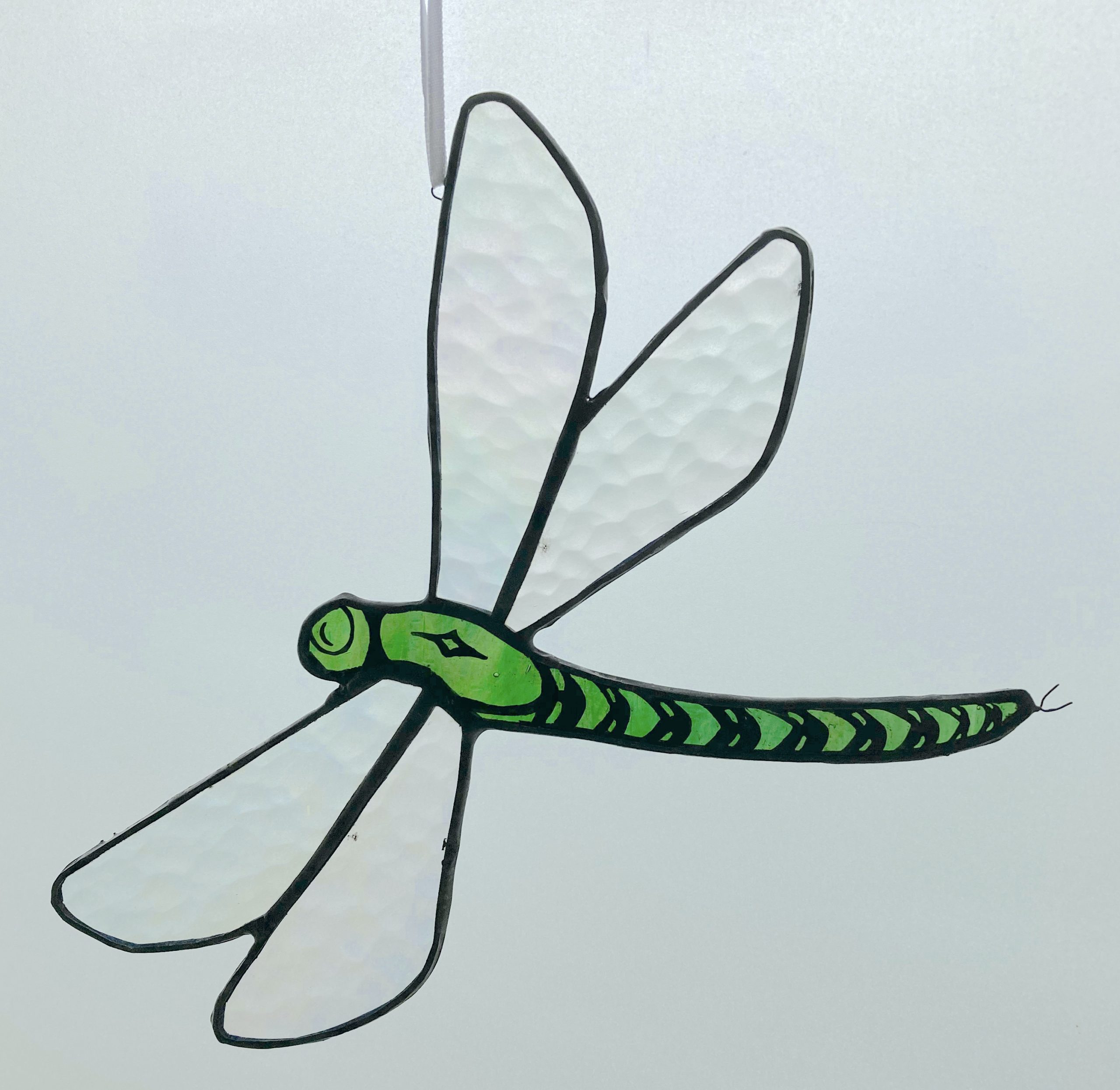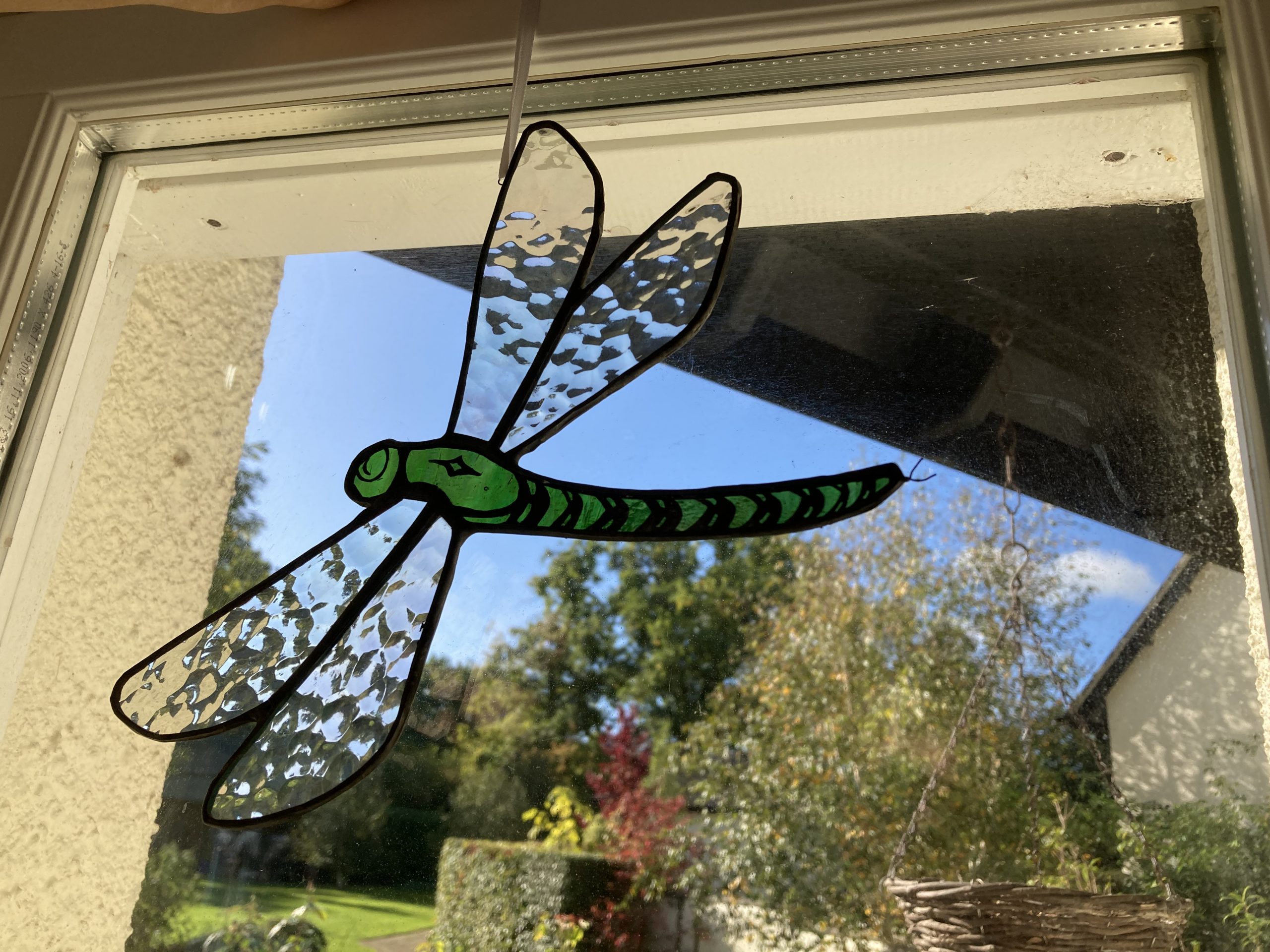 Hand crafted green stained glass dragonfly sun catcher, perfect for brightening up your home or work space and for insect lovers.