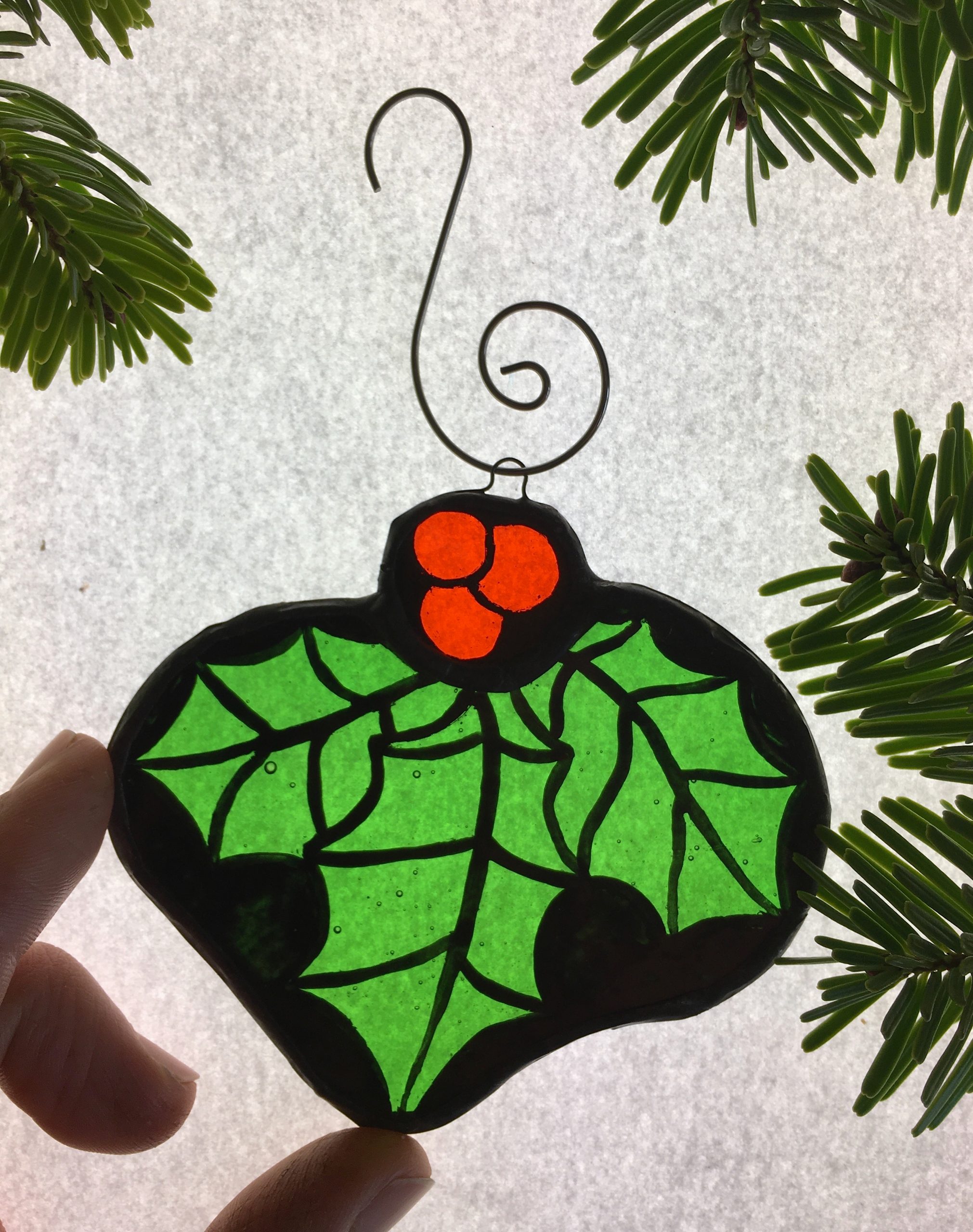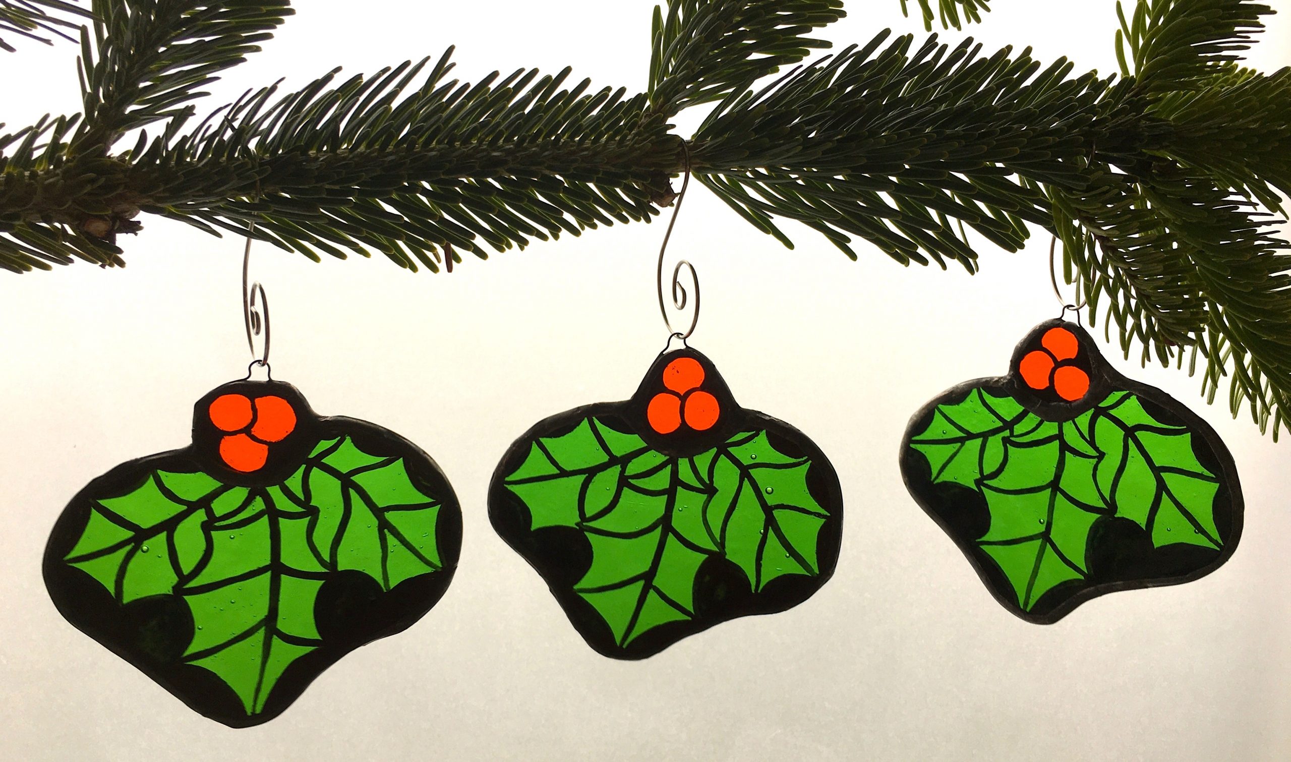 Also available as a set of three: https://scarabstainedglass.com/product/set-of-3-holly-stained-glass-christmas-tree-decorations/