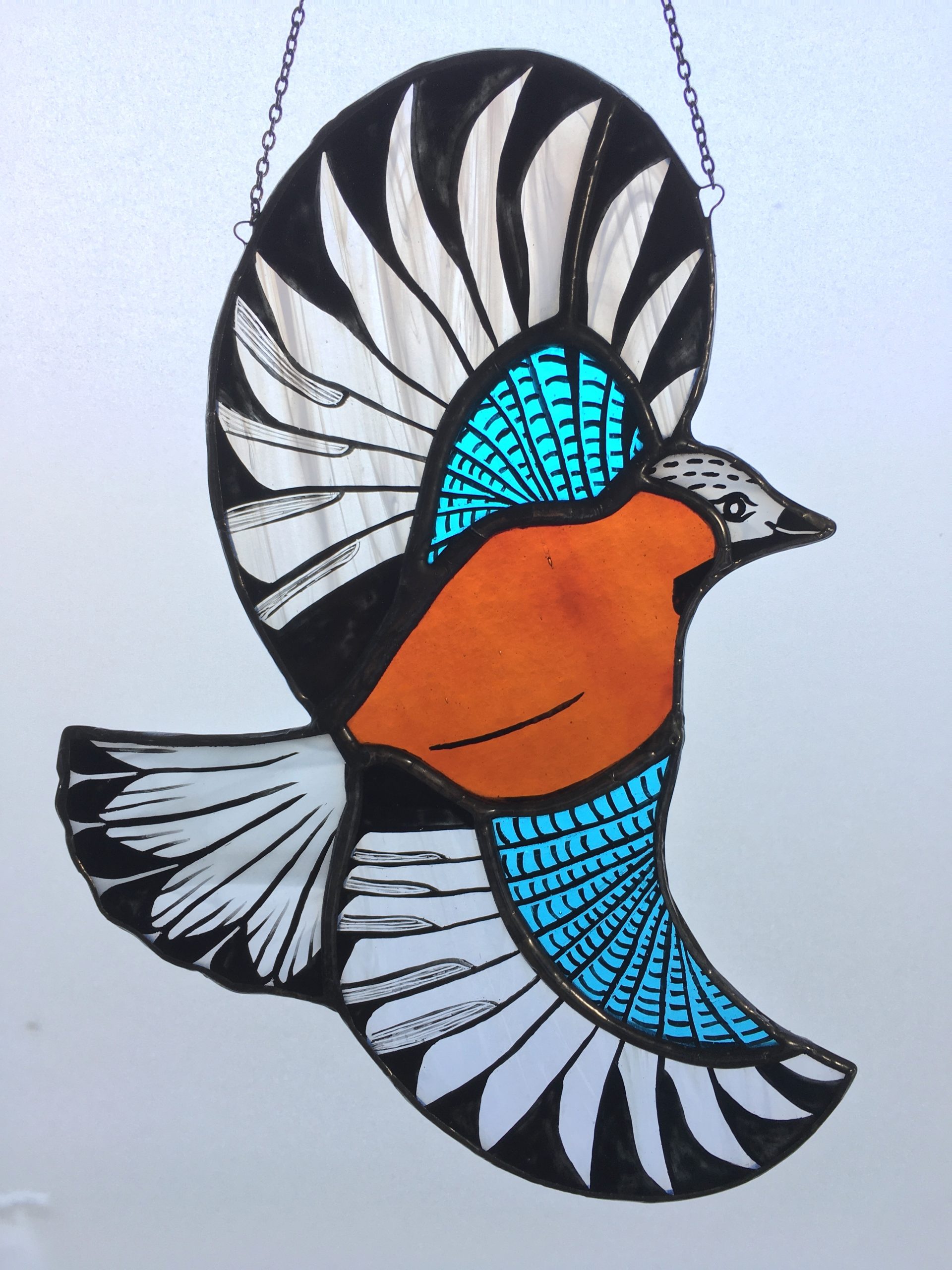 The wings and tail of the jay are made with delicate whiskey white stained glass. The details on the wings and its body are made with bright blue and burnt orange coloured glass.
