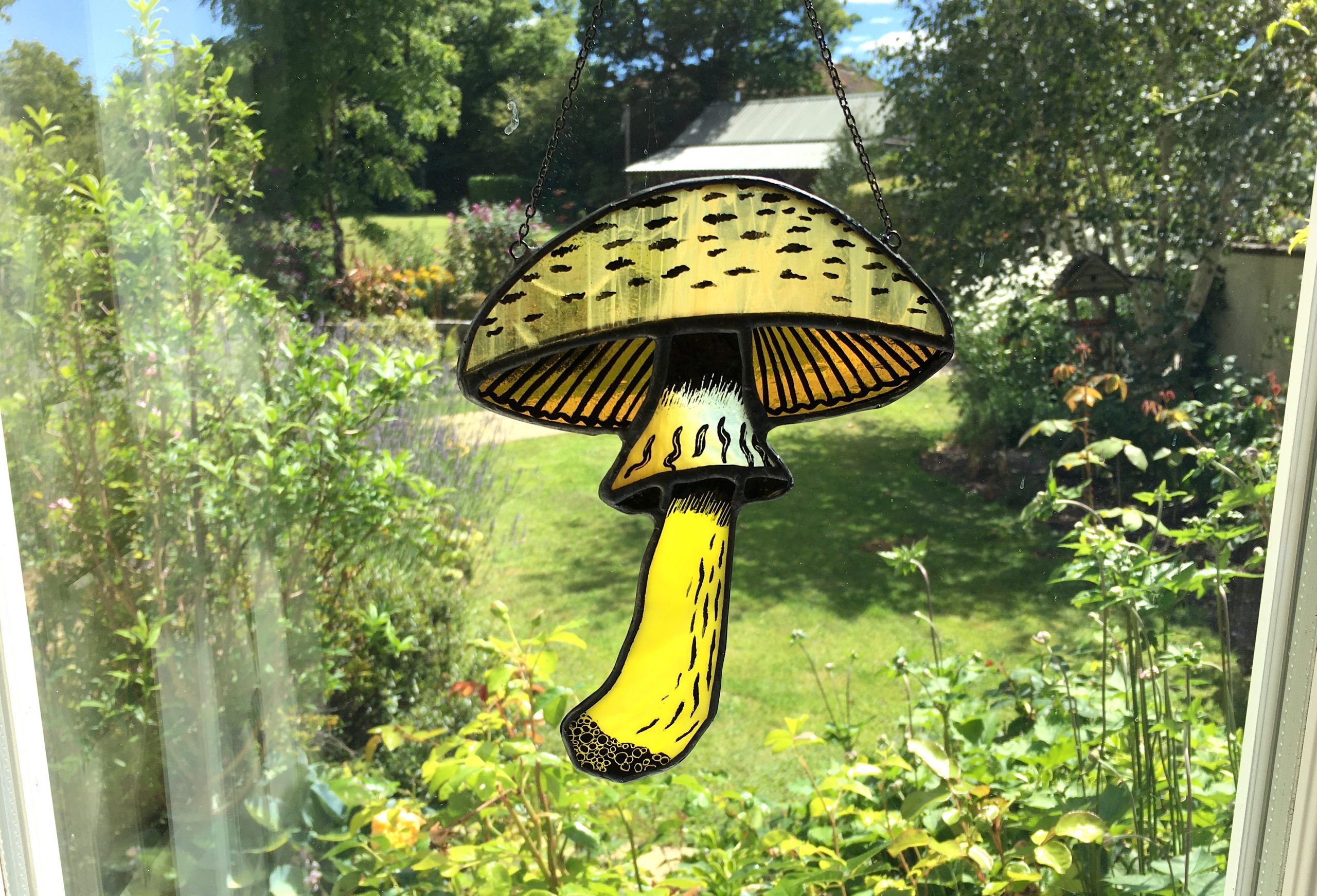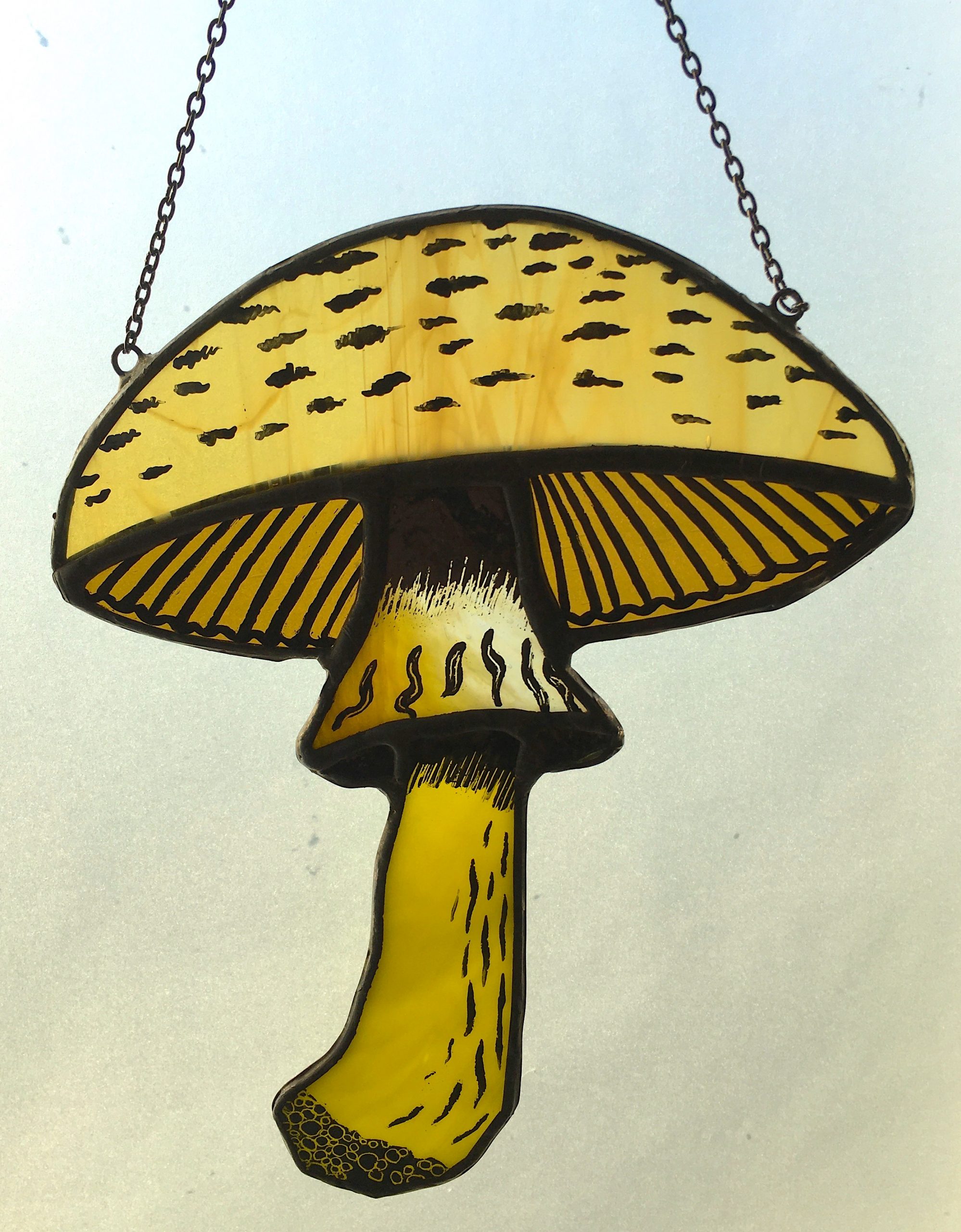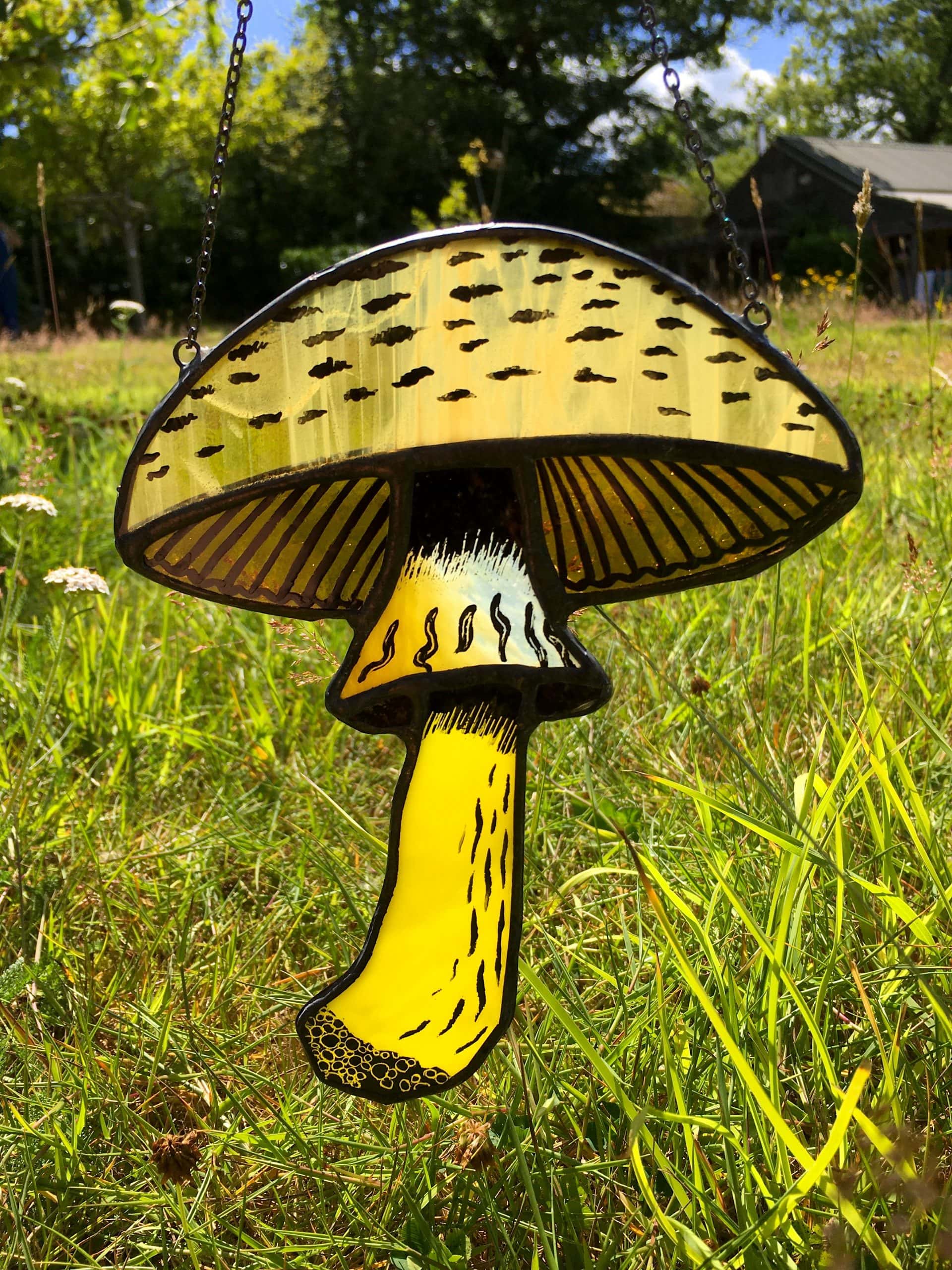 Hand crafted and painted stained glass flat topped mushroom sun catcher.