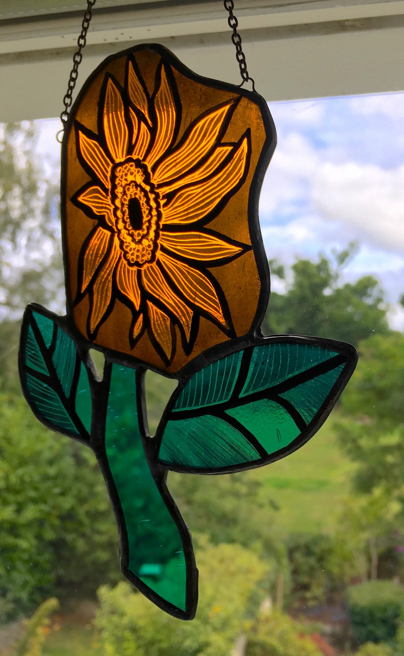 Hand-painted stained glass sun catcher made with lead paint fired in the kiln, joined using copper foil and lead solder with copper wire reinforcement for added strength.