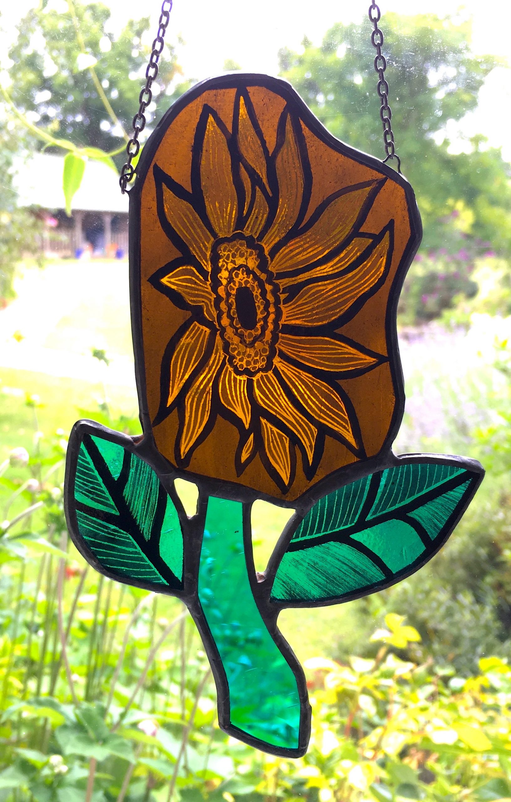 Hand crafted and painted orange stained glass sunflower sun catcher.