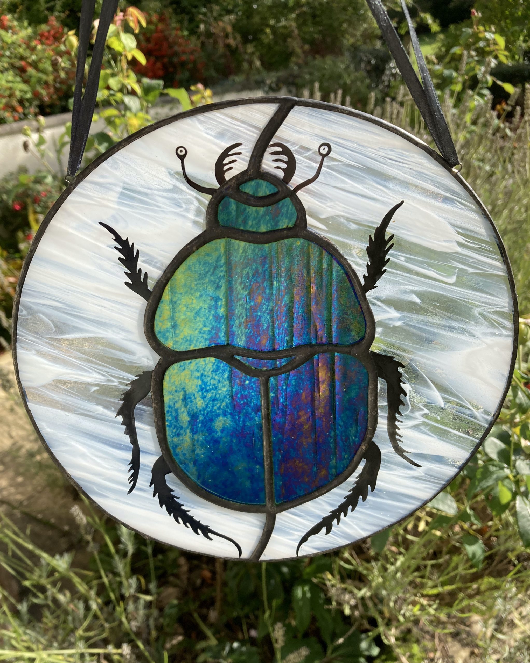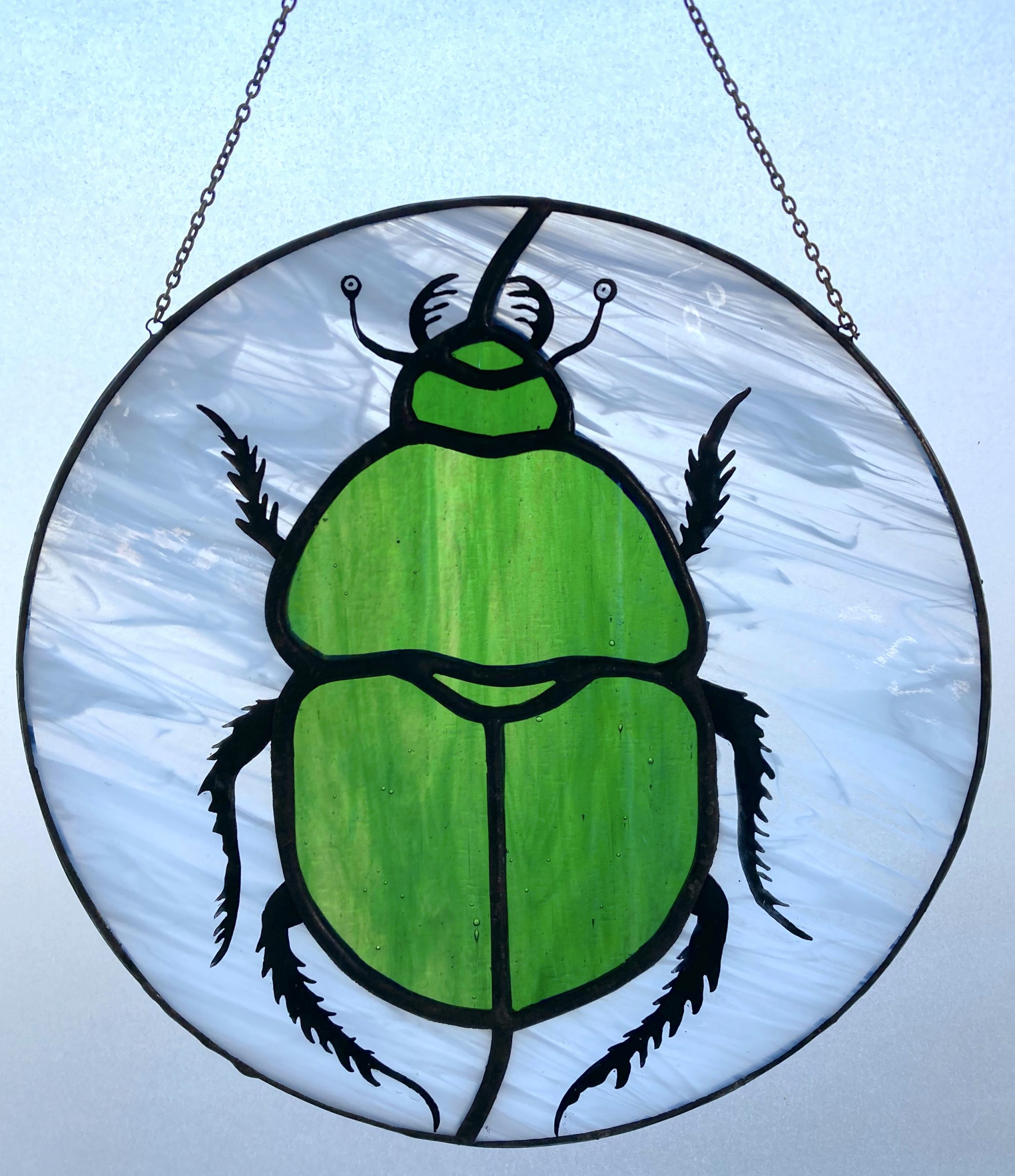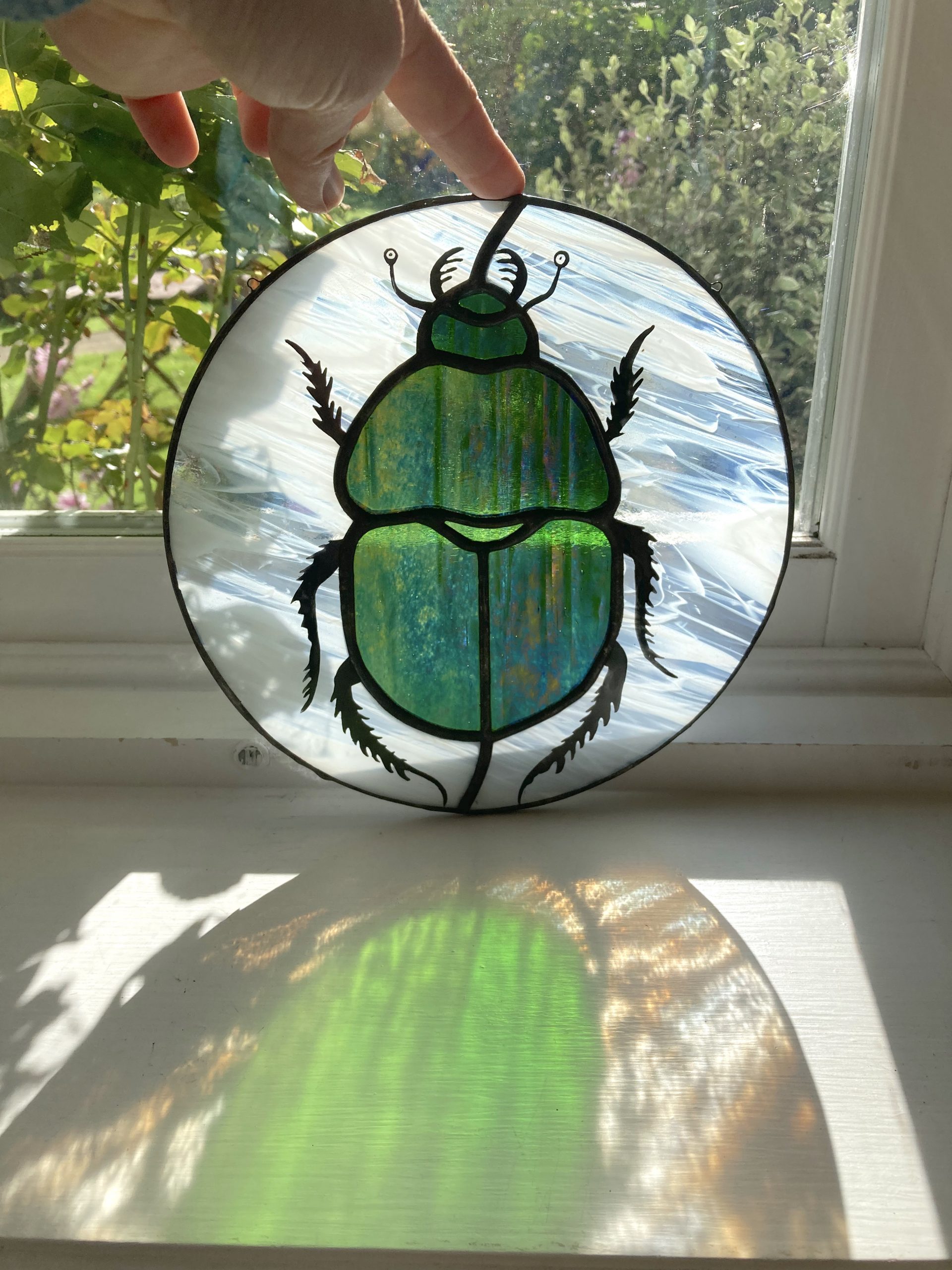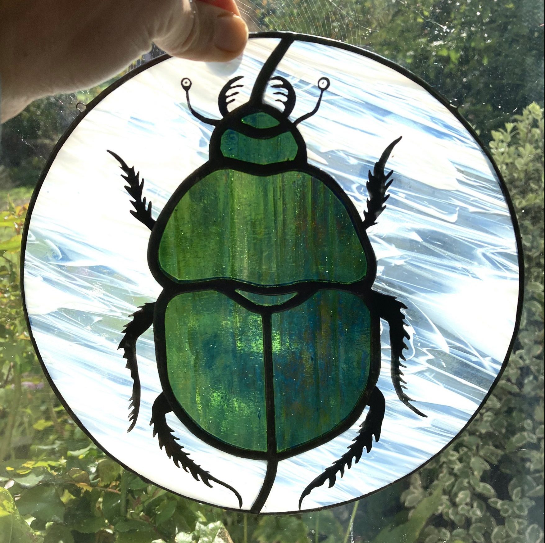 Striking stained glass scarab beetle sun catcher, perfect for brightening up your home or work space and for insect lovers.