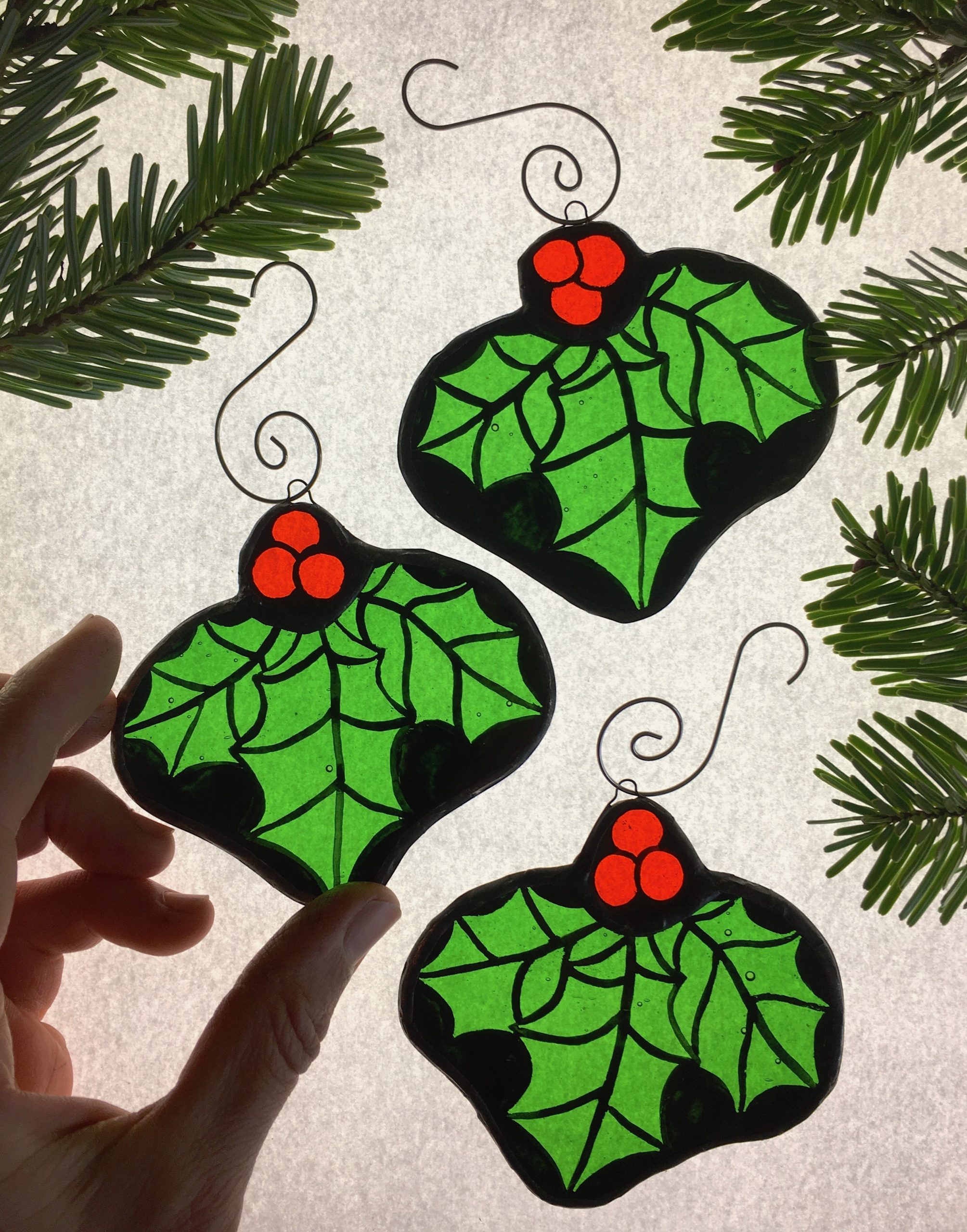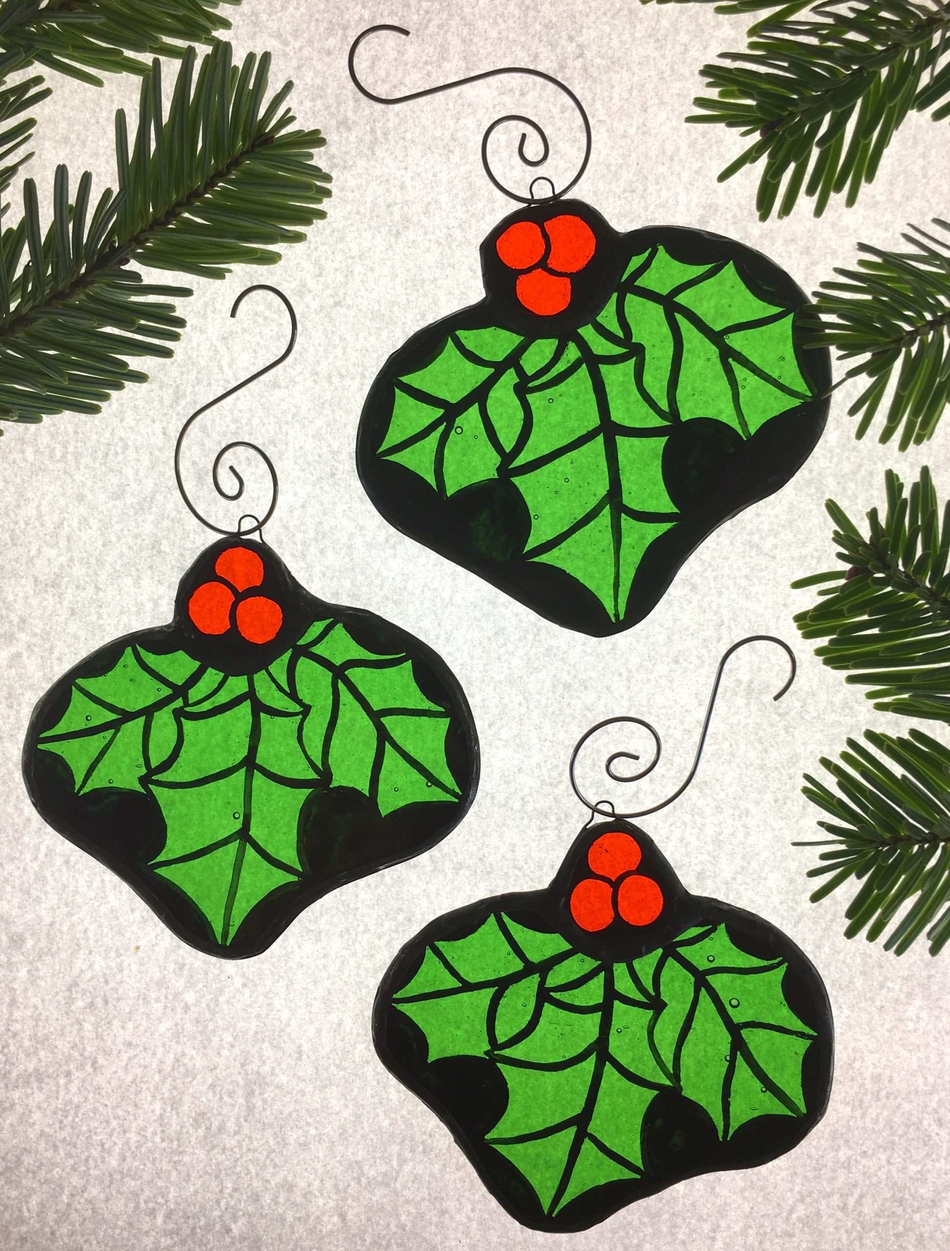 Also available to purchase individually: https://scarabstainedglass.com/product/holly-stained-glass-christmas-tree-decoration/