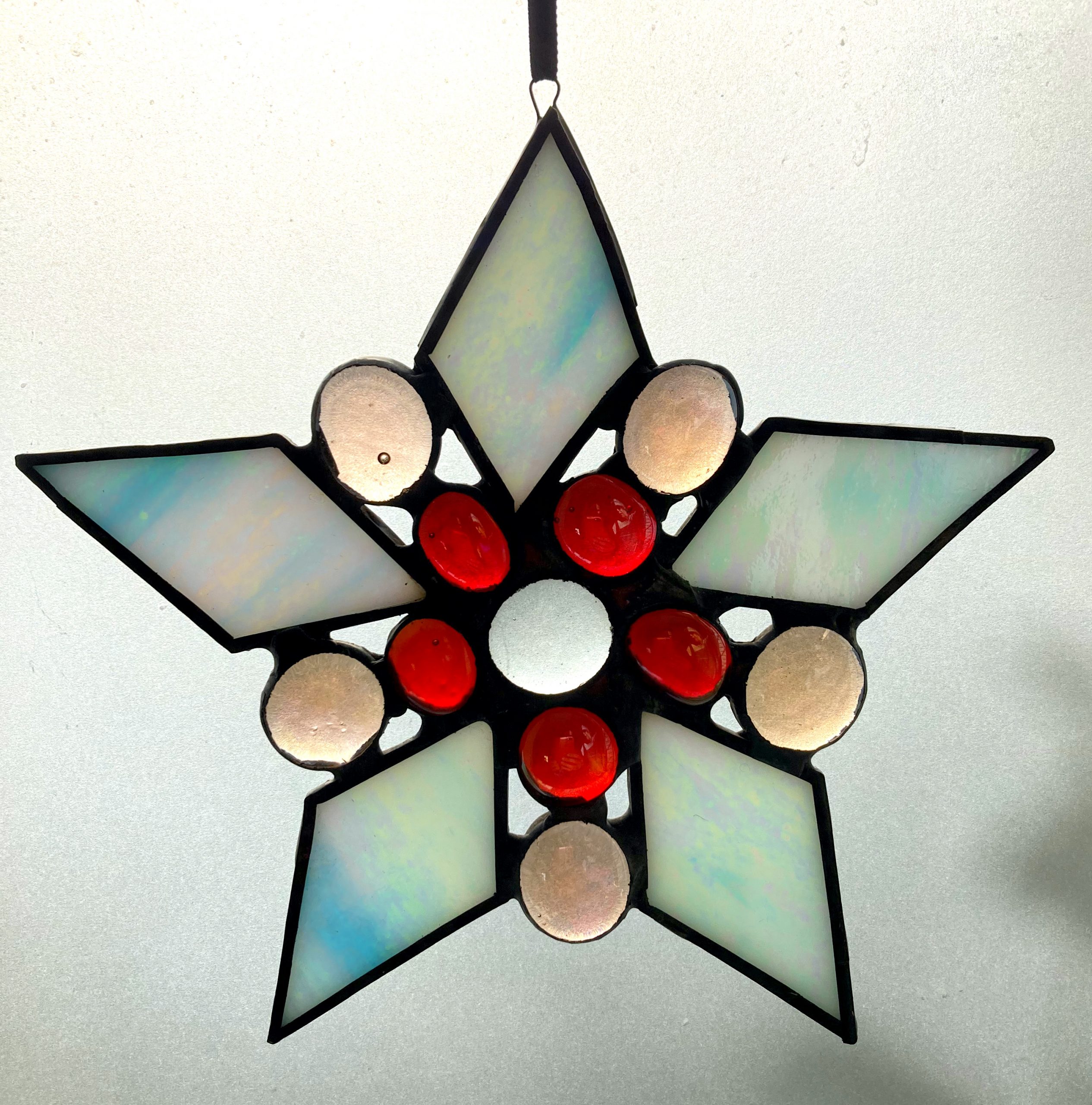 A handcrafted stained glass Christmas star decoration to adorn your home. Iridescent blue with red and light pink circles.