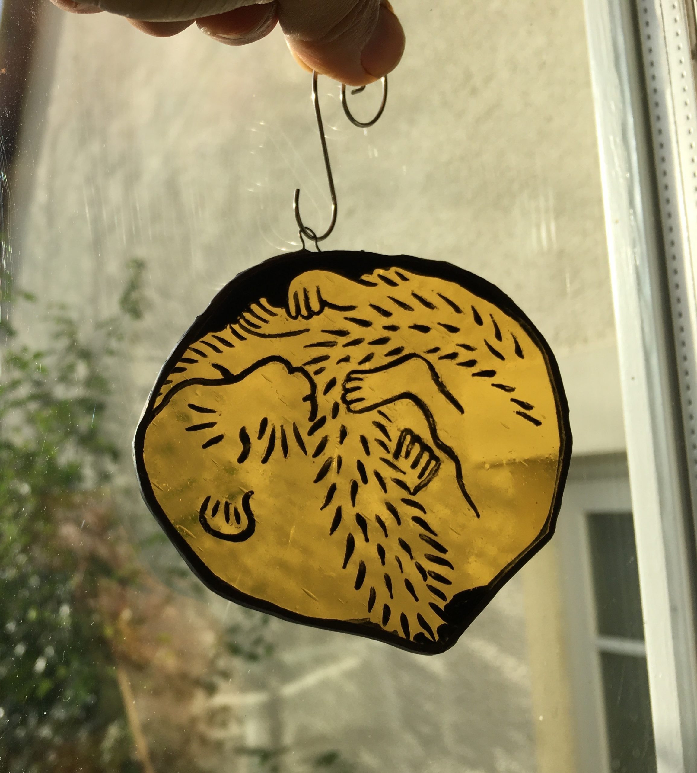 Made with stained glass, copper foil and soldered together. Hand painted and fired in the kiln.