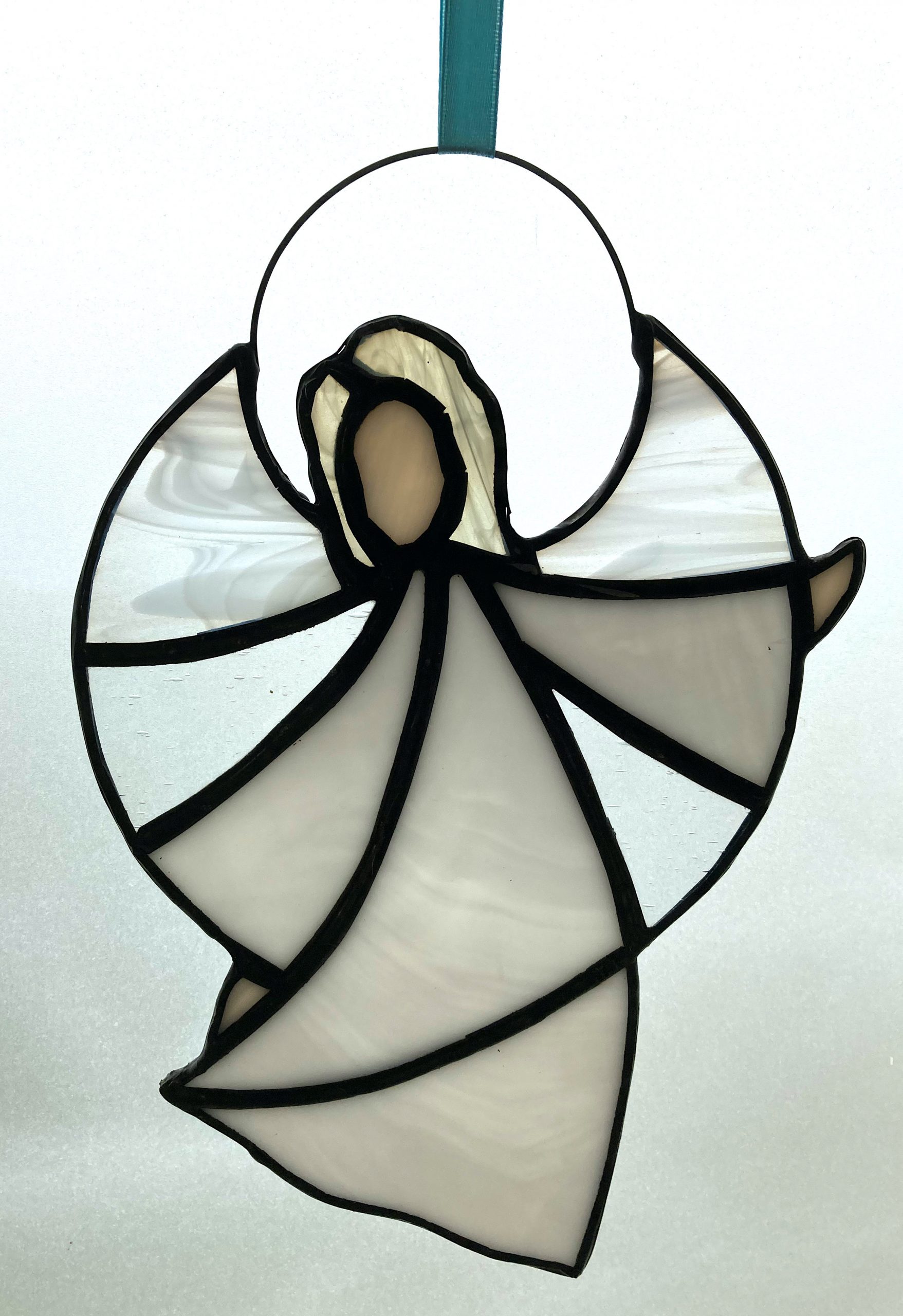 A white hand crafted Christmas stained glass angel sun catcher, perfect seasonal gift or decoration for your home.