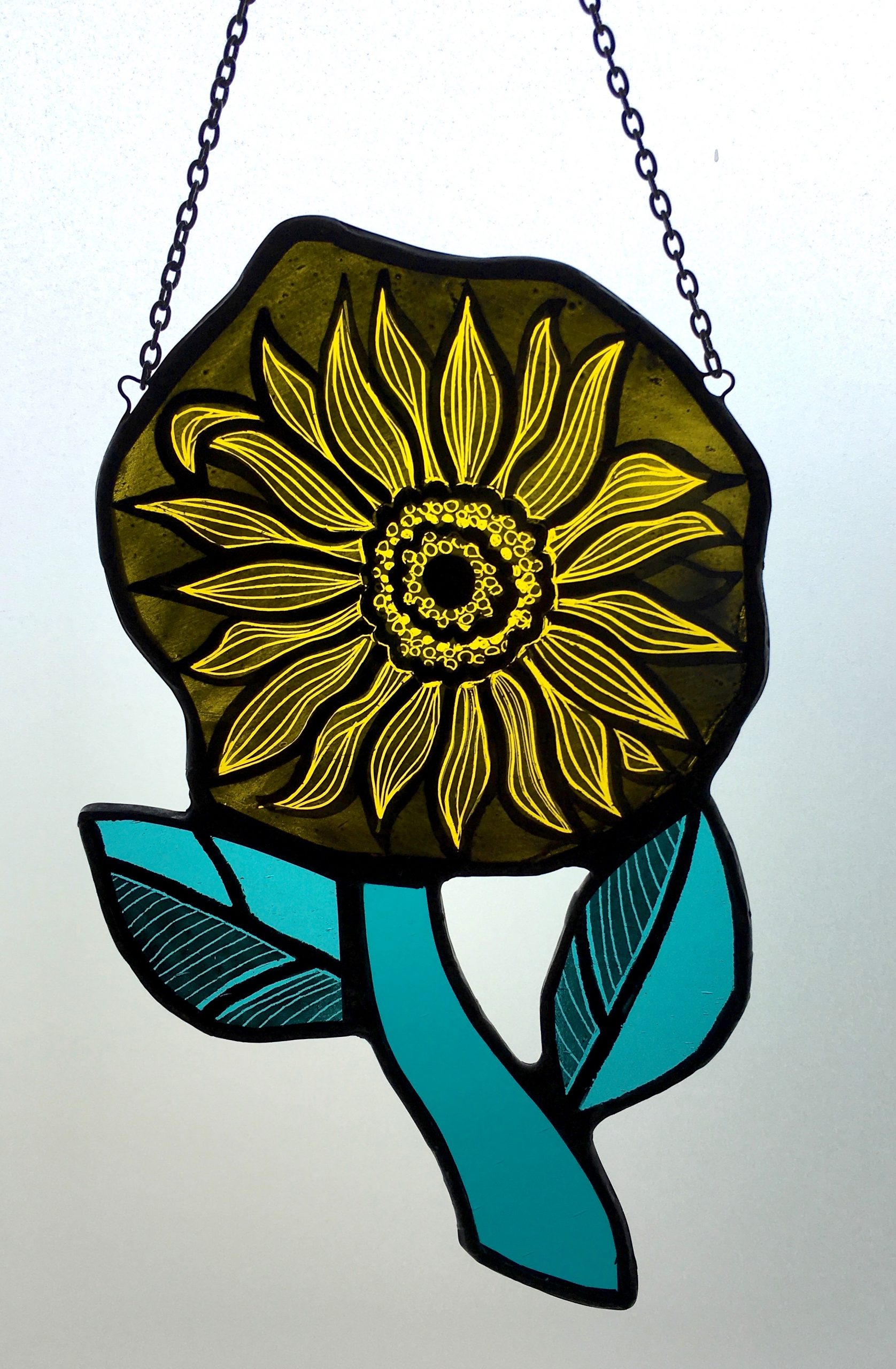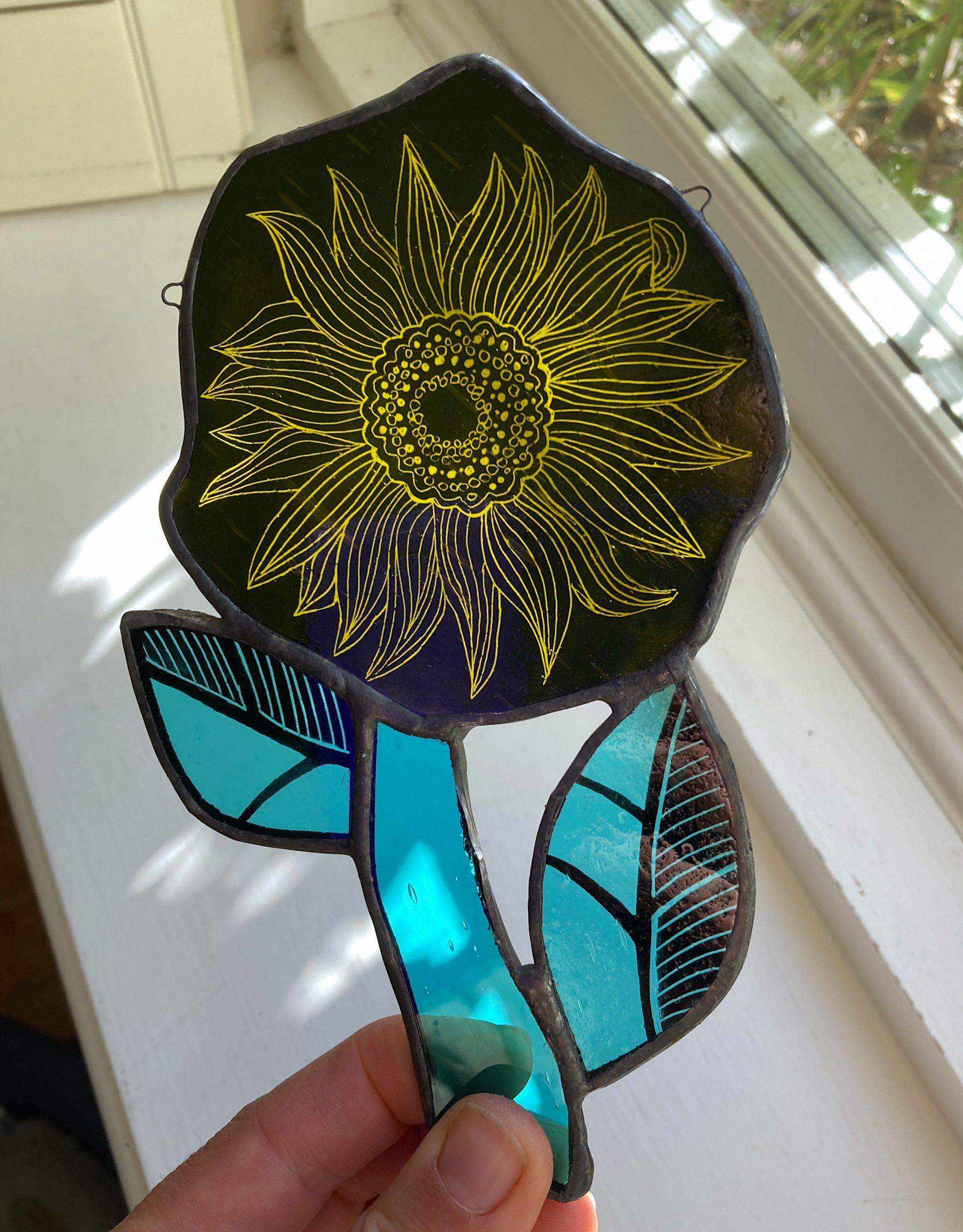 Hand-painted stained glass sun catcher made with lead paint fired in the kiln, joined using copper foil and lead solder with copper wire reinforcement for added strength.